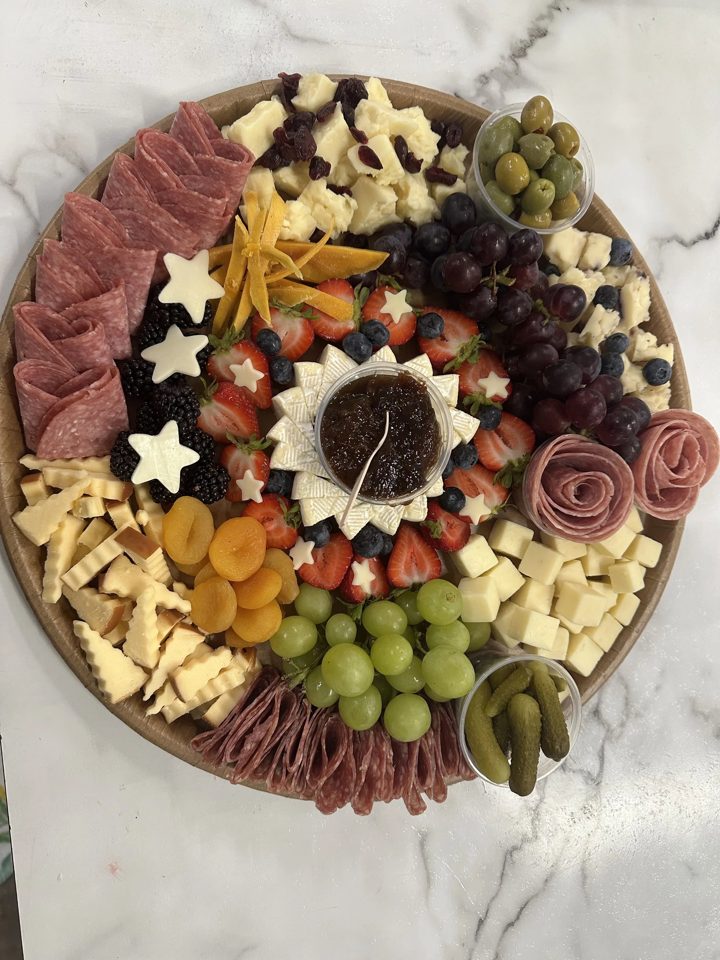Our Premium Boards have a diverse selection of exotic meats and cheeses, fruits, nuts, cornichon pickles, olives and crackers.
